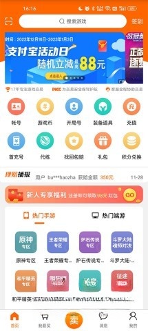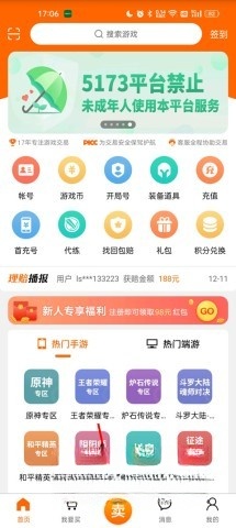 打開5173游戲交易平臺手機版后,您會看到主菜單里包含賬號、游戲幣、裝備等相關信息。