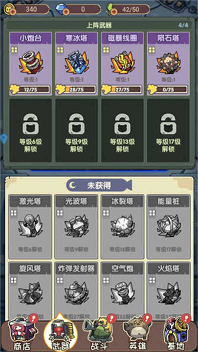 點擊【武器】按鈕,就能查看已解鎖的各類炮塔。當收集到足夠的碎片時,就可以對炮塔進行升級,讓它變得更有殺傷力,幫助你更輕松地擊退敵人。