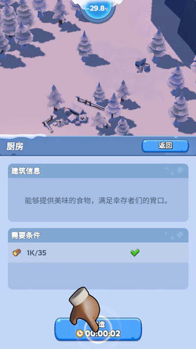 有了火源之后,既能取暖,也能用來烹飪食物。點擊地圖上的任意空地,打開建筑界面,優先建造廚房,保障幸存者的溫飽需求。