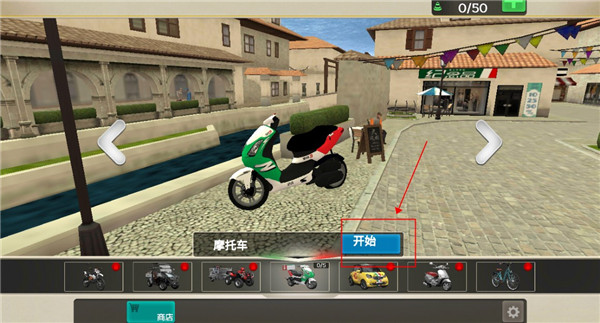 在本站完成安裝后,點擊打開即可進入游戲,此時會直接獲得一輛可使用的小摩托,我們點擊開始按鈕就能啟動游戲。