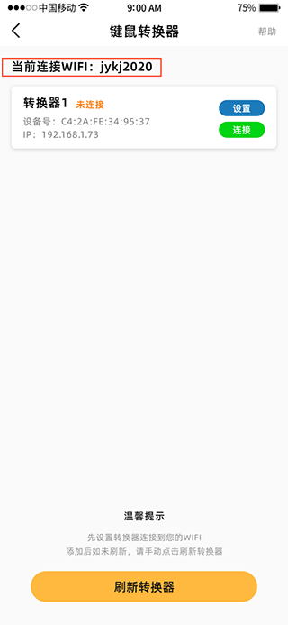 返回后,請檢查鍵鼠轉換器是否成功連接WIFI,具體可參照圖示(若連接成功卻未顯示轉換器,可點擊【刷新轉換器】按鈕)。完成上述操作后重新連接,就能在云電腦或云游戲里使用鍵鼠了~