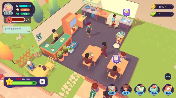 隨著接待的客人日益增多,餐廳積累起一定口碑后,你就能通過招聘服務(wù)員與廚師來提升服務(wù)顧客的效率,作為店長(zhǎng)的你便可以擺脫繁瑣事務(wù),輕松管理啦!