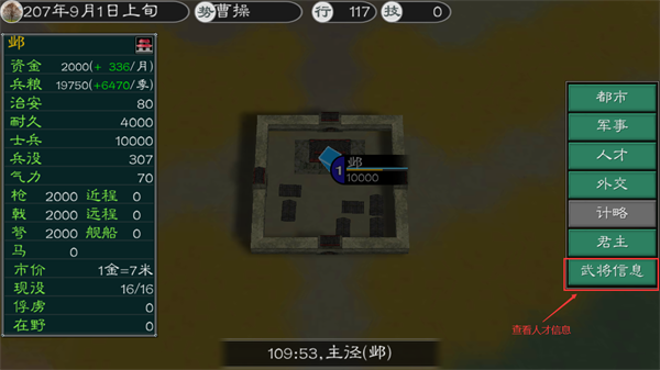 游戲開局初期通常不會爆發戰爭,我們只需專注于建造各類建筑。要是建筑按鈕變成灰色,意味著暫時沒有可派遣執行該建設任務的武將,這時候我們可以轉而選擇治安、征兵、出征等其他行動。