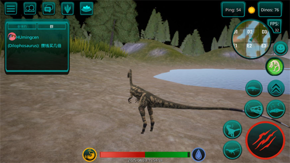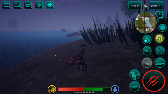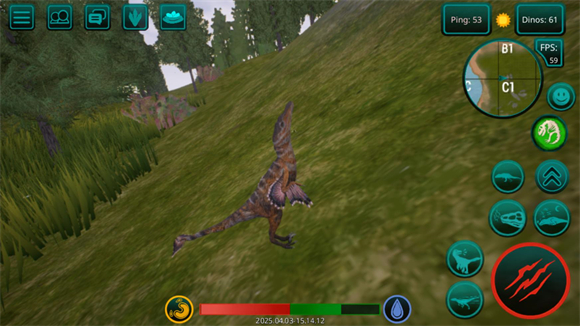 進入游戲后,左側控制恐龍移動,右側依次是奔跑、跳躍、攻擊按鍵;屏幕下方中間顯示你的血量與體力,兩側則是饑餓值和饑渴值。找到食物后,點擊帶有爪子圖標的按鈕即可進食。