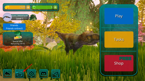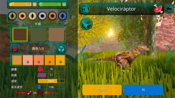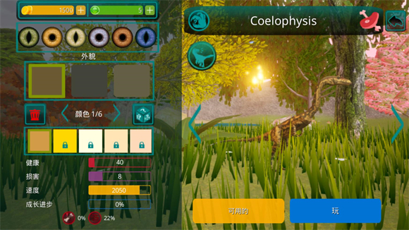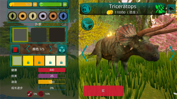 在主界面點擊“玩”按鈕,就能進入恐龍選擇界面;通過點擊左右箭頭,可以切換不同的恐龍角色。屏幕左側設有恐龍自定義功能,下方則展示著恐龍的各項具體數值。當你擁有足夠金幣時,點擊“購買”按鈕即可解鎖新的恐龍。