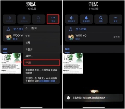 點(diǎn)擊“更多”選項(xiàng),接著開啟“自動(dòng)刪除消息”功能,再設(shè)置好對(duì)應(yīng)的時(shí)間。