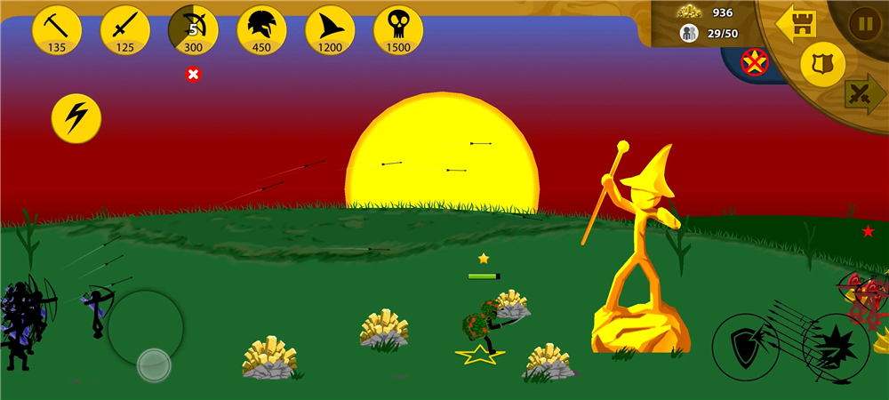 開局先造一張弓,補到八名礦工后,寒冰弓箭手在應對對手的矛兵開局或劍士開局時都能形成絕對壓制。等弓箭手數量達到七八個左右,就出一個矛兵,接著可以直接壓到對手家,這期間要持續補充弓箭手。