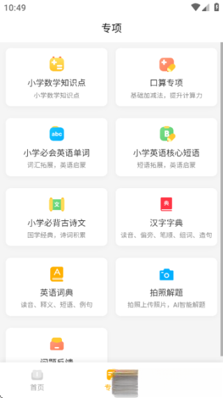 孩子完成作業清單上的任務后,在軟件里標記“已完成”;要是需要輔導,就能進入“專項”板塊,使用“口算練習”“拍照解題”“字典查詢”這類工具。