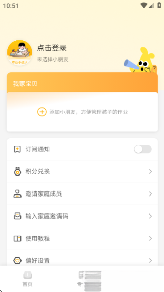 進入“我的 - 我家寶貝”頁面添加孩子檔案,填寫內容包括姓名和學齡階段,例如“肉肉 - 小學2年級”。