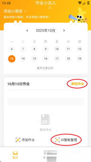 回到首頁后,先挑選具體日期(例如10月13日),接著點擊“添加作業”按鈕——可以手動錄入作業相關內容,也能選擇“AI智能整理”功能并上傳作業照片,之后耐心等待系統自動將內容拆解成任務清單。