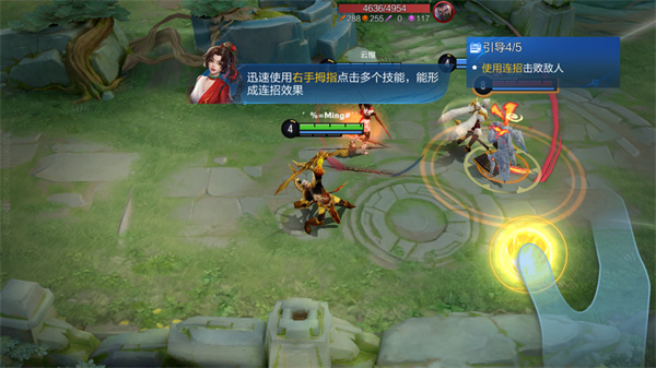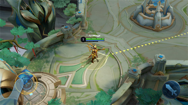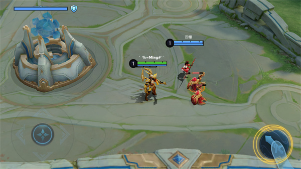 選擇完畢后,進入峽谷地圖,根據提示,借助左下角的虛擬搖桿,即可操控英雄靈活移動。
