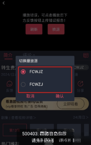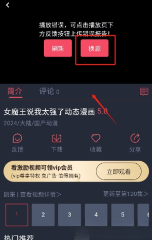 首先在首頁挑選自己感興趣的動漫,要是無法播放,就點擊換源按鈕。