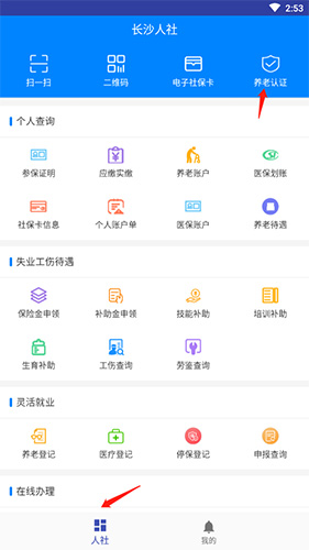 打開軟件后,找到底端的“人社”選項并點擊,接著再點擊“養(yǎng)老認證”選項。