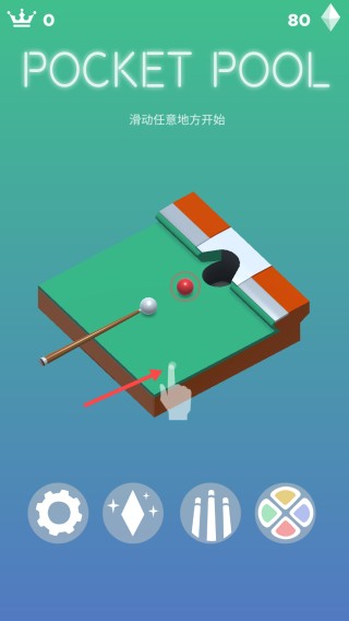 打開口袋臺球游戲,用手指滑動調整瞄準線,瞄準紅色球進行擊打,開啟第一關卡的挑戰。