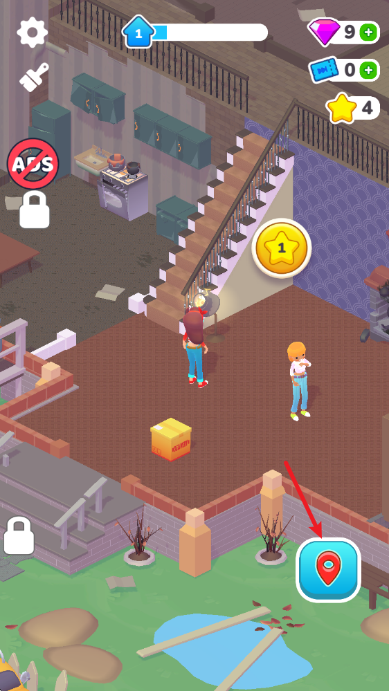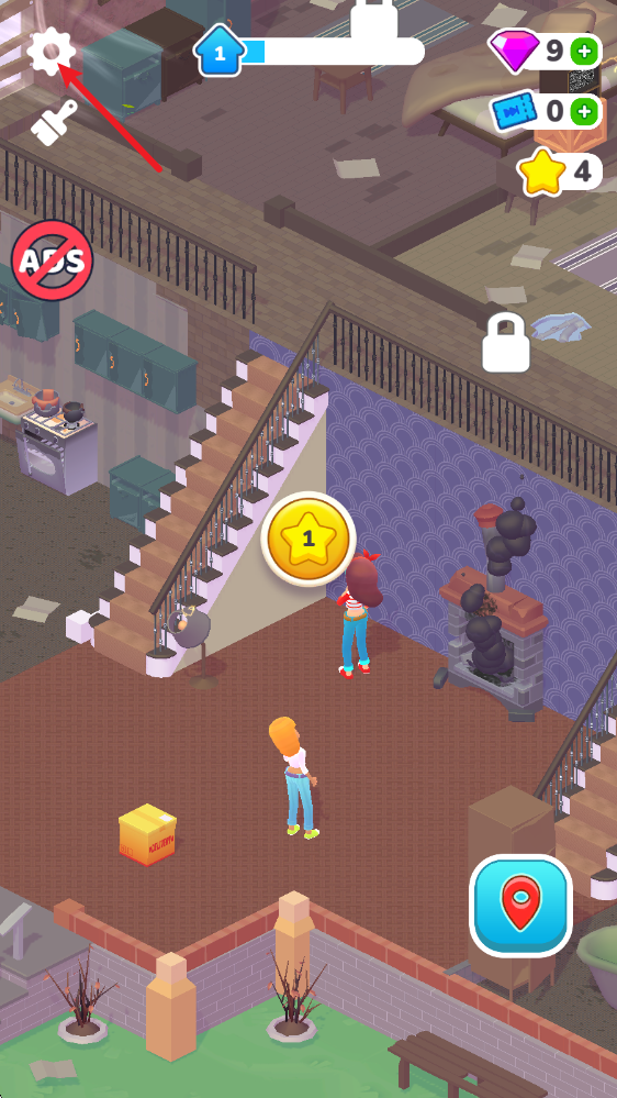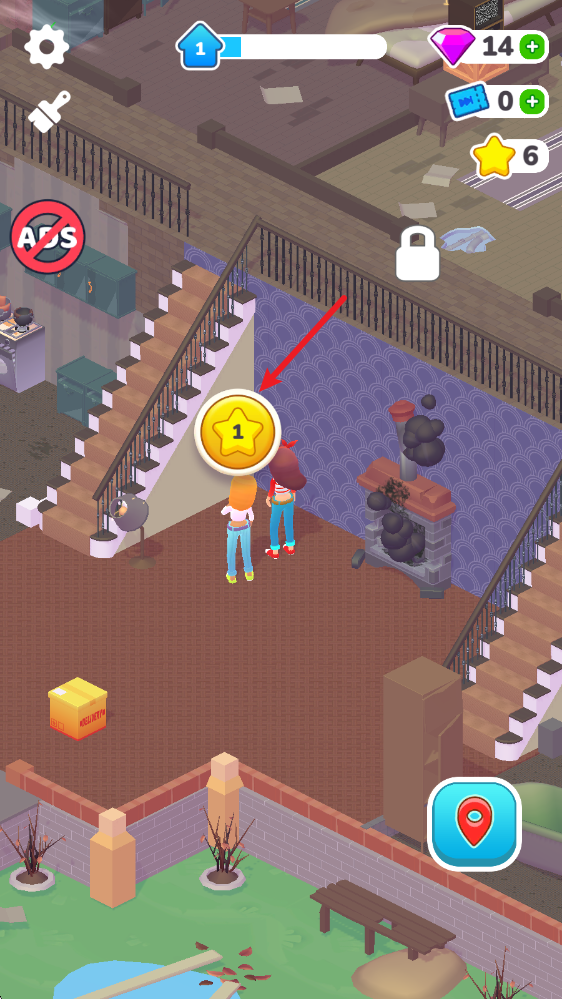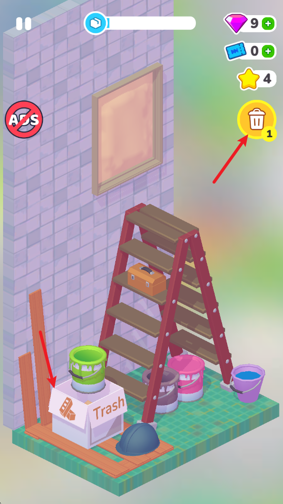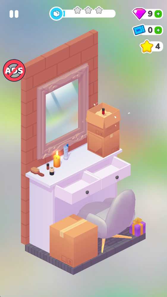 關(guān)卡設(shè)置了三個(gè)步驟,第一步是把場(chǎng)景里的舊物品用箱子收納好,而右上角的按鈕是可以一鍵完成收拾的道具。