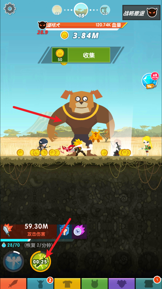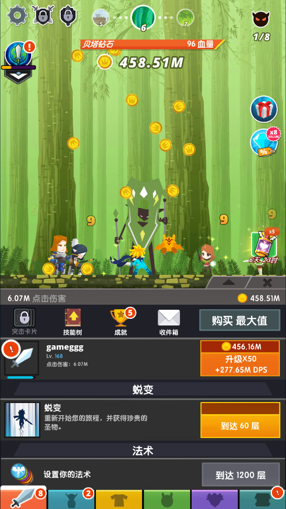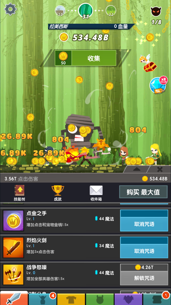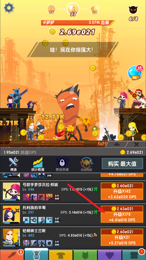 有了足夠的金幣后,我們可以對人物的傷害進(jìn)行升級。