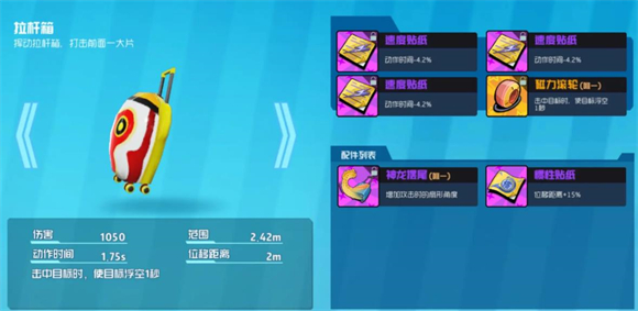 拉桿箱的必備配件是橙色滾輪,輔助配件可選擇三個(gè)紫色速度貼紙,若沒有紫色的,也可以選藍(lán)色的。