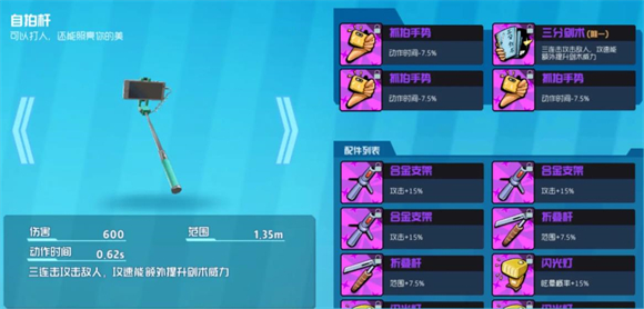 自拍桿主要分為三分流和斬鐵流兩大方向,常用的配件包括抓拍手勢(對應(yīng)速度屬性)、合金支架(對應(yīng)攻擊屬性)、折疊桿(對應(yīng)范圍屬性)以及閃光燈(對應(yīng)眩暈效果)。