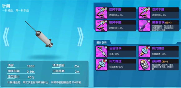 針筒有三種類型,分別是補(bǔ)血、敵敵畏和噴射。輔助配件建議搭配三速,在進(jìn)行吃雞游戲時(shí)推薦使用敵敵畏類型的針筒,其他場景下這三種類型的針筒組合使用都是可行的。