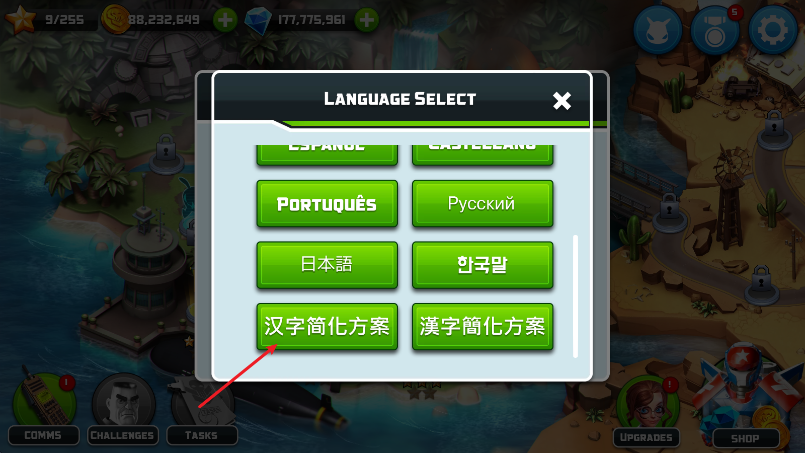 然后滑動到頁面底部,找到“漢字”相關的選項,點擊確認按鈕后,重新啟動游戲就能完成切換了。