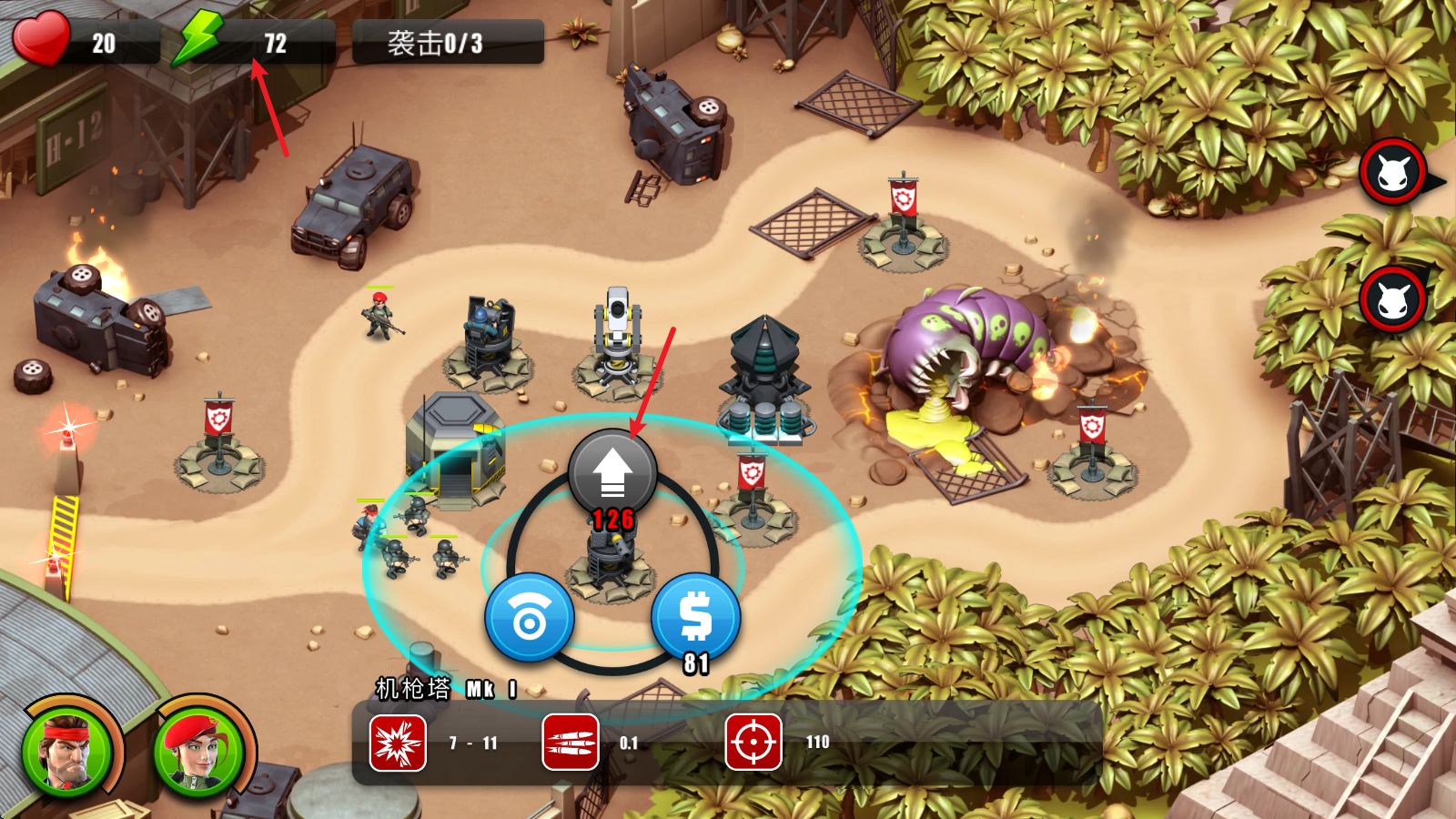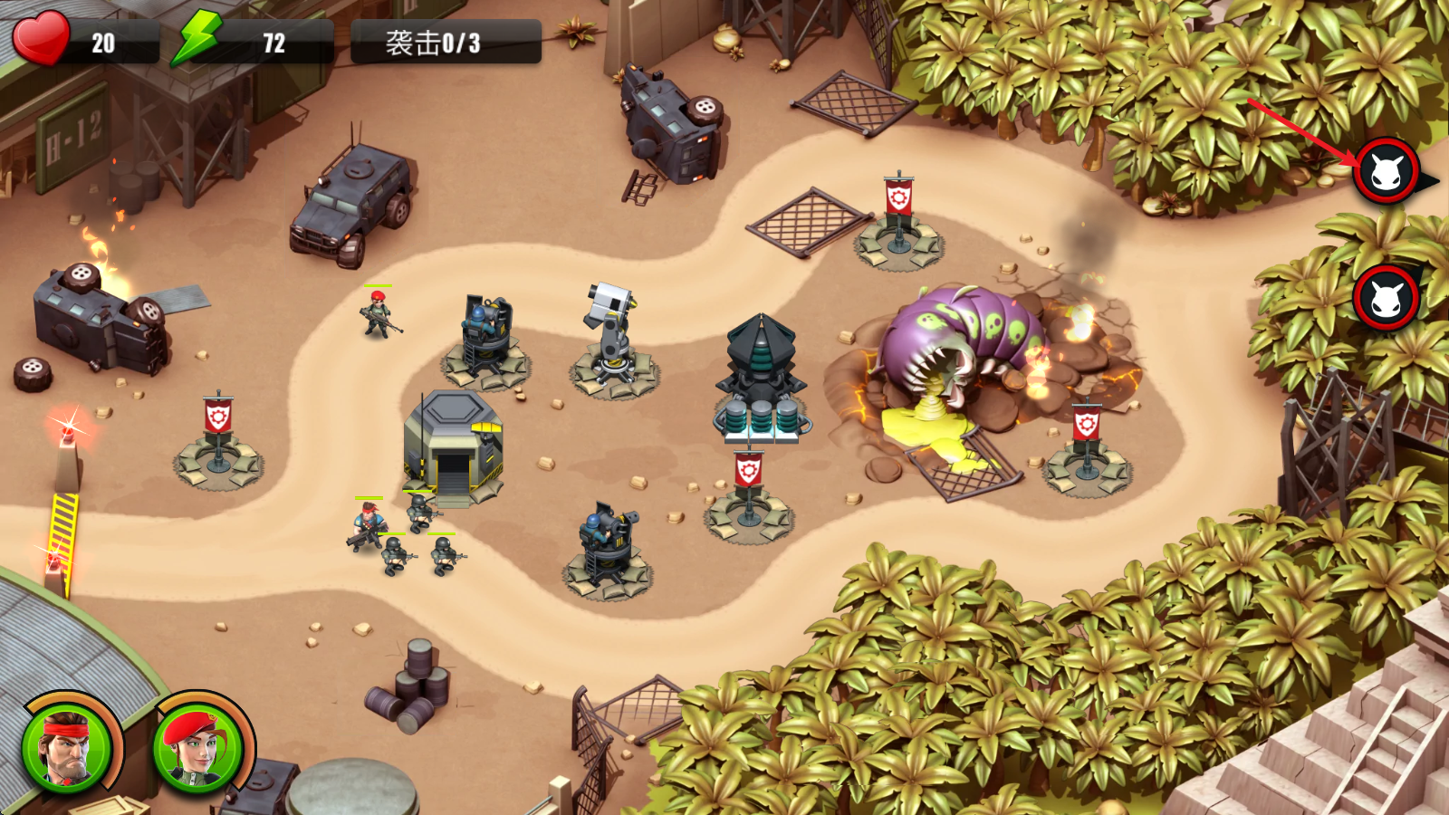 當怪物進入攻擊范圍時,防御塔與英雄們便會發起攻擊,成功擊敗怪物后,就能獲取金幣和能量。