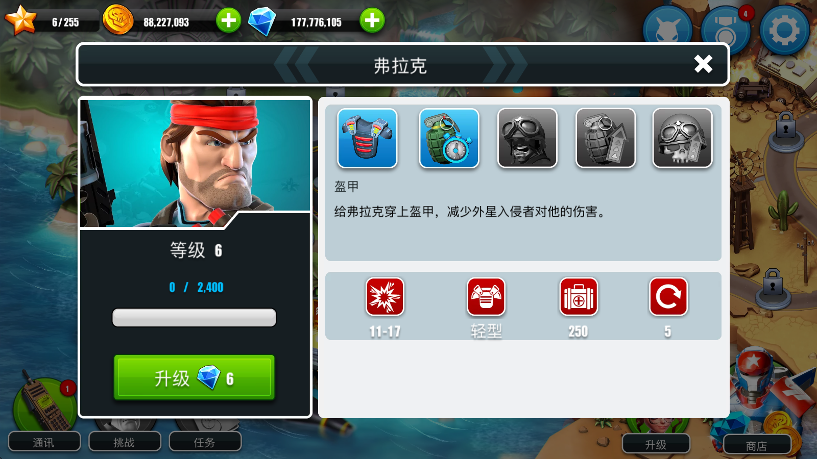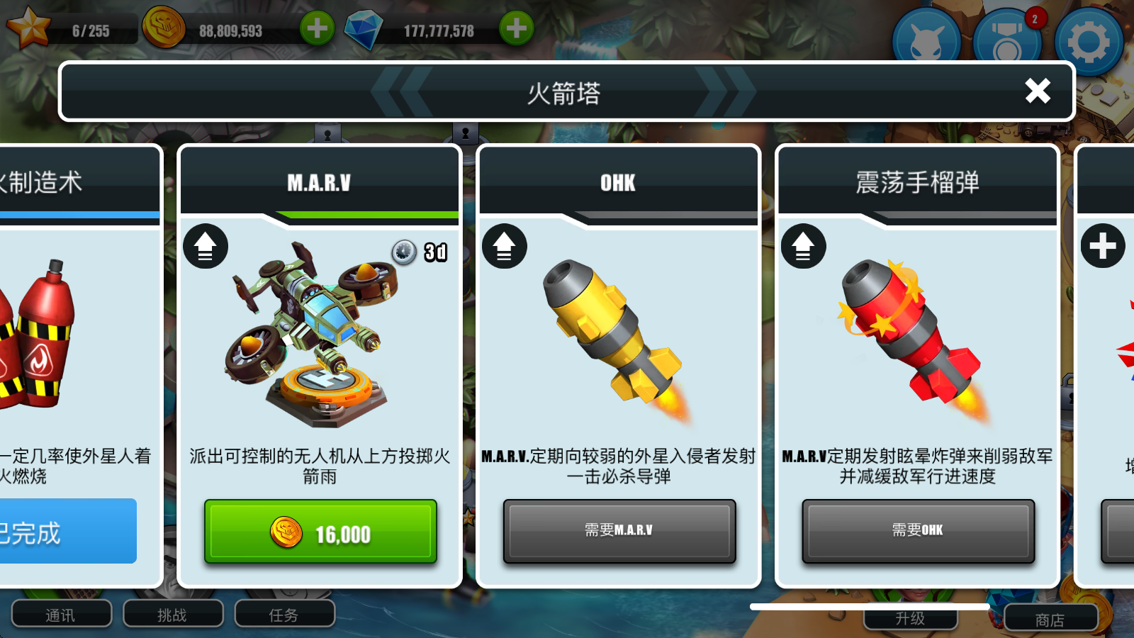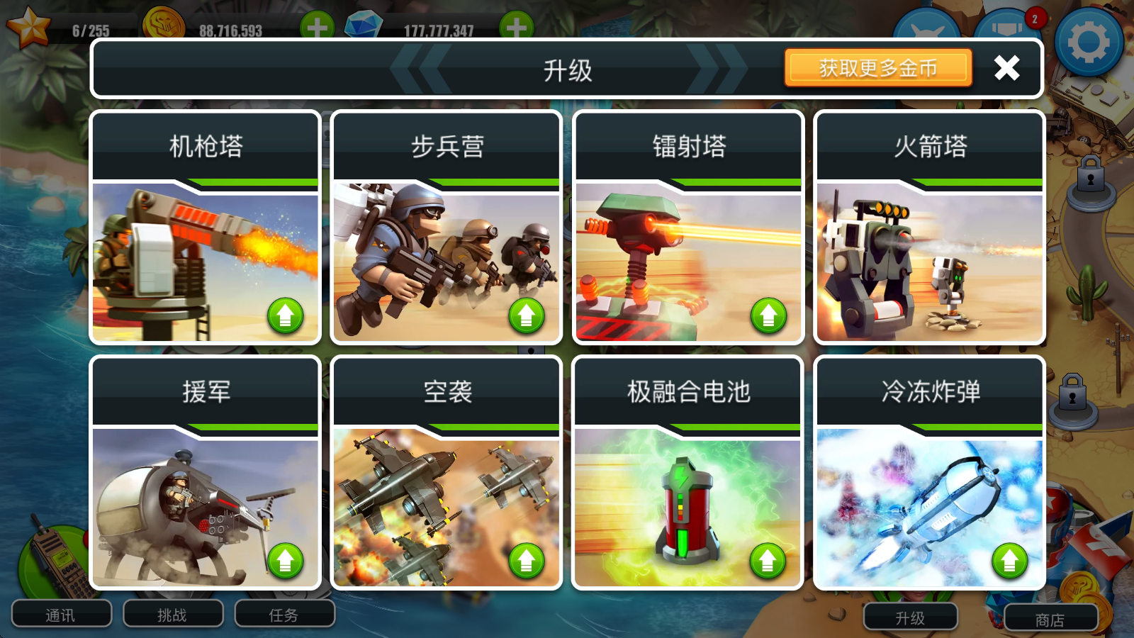 在主界面點擊右下角的“升級”按鈕,即可在此處挑選各類防御塔或支援道具來進行強化操作。