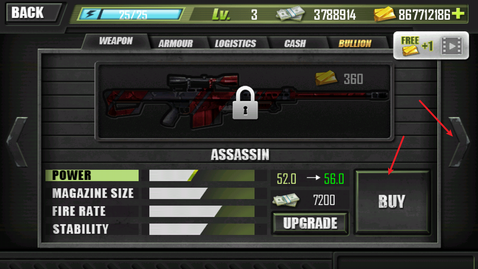 進入之后,點擊箭頭就可以切換各種武器進行購買。