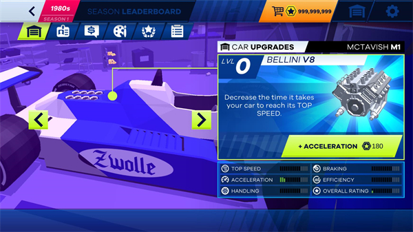 在挑選比賽類型的界面,點擊右上角齒輪圖標旁邊的車庫入口,就能對賽車進行改裝;通過升級各類配件,還能進一步提升賽車的性能表現。