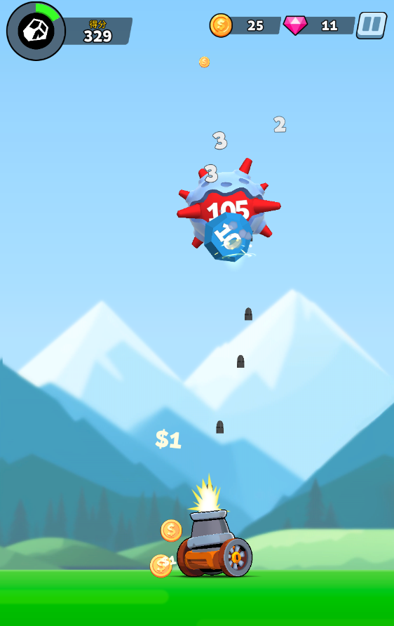 當你擊中屏幕上的數字球時,它會依據大炮的傷害值逐漸縮小,直到數值變為零,同時還會掉落道具、金幣這類物品。