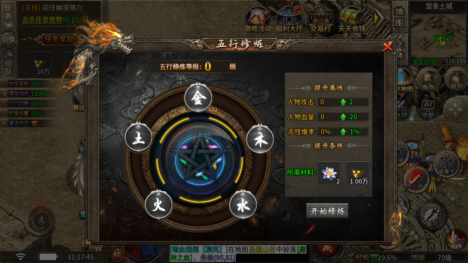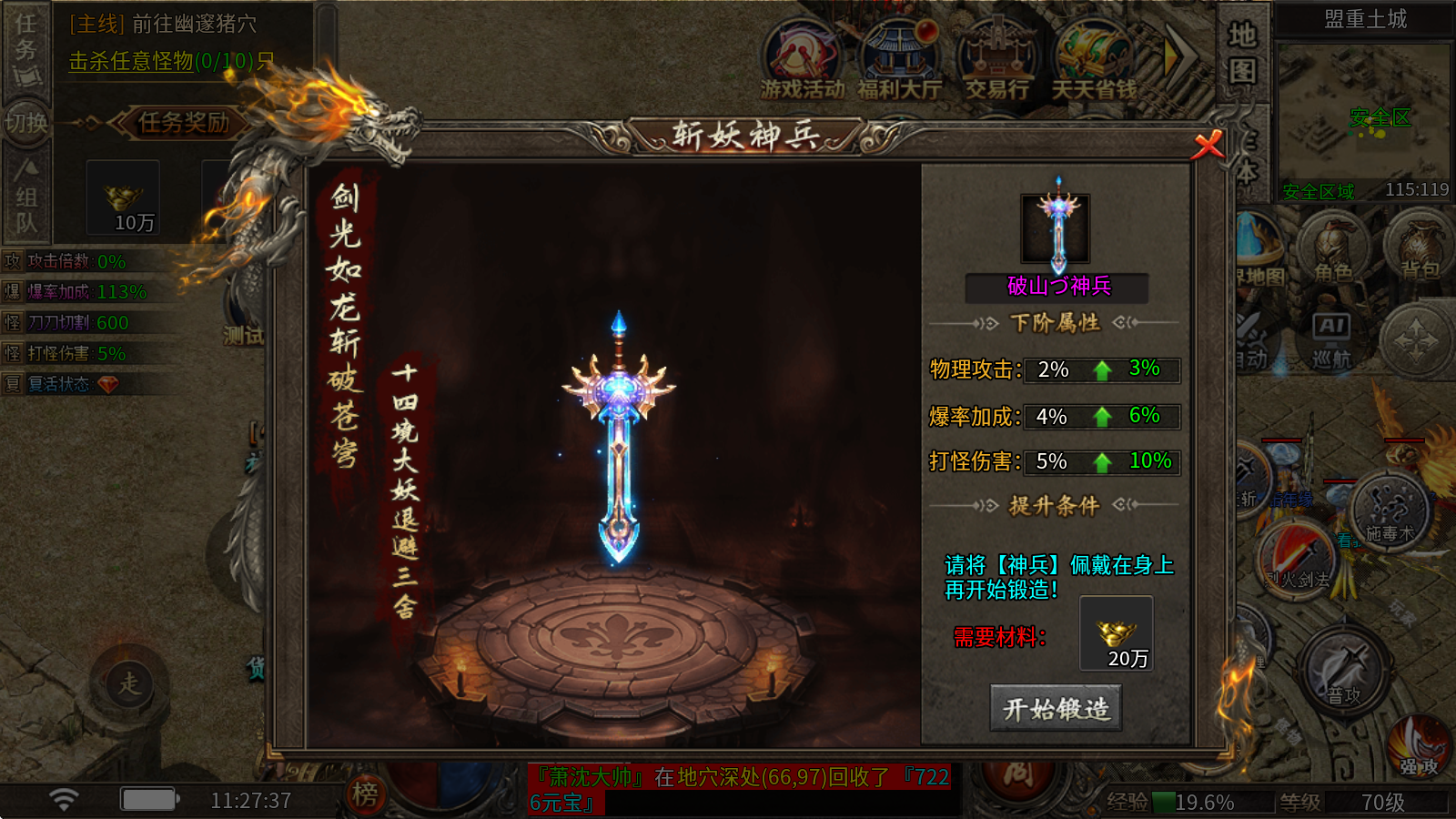 斬妖神兵:花費元寶就能直接升級,能提高打怪時的傷害和物品掉落概率。
