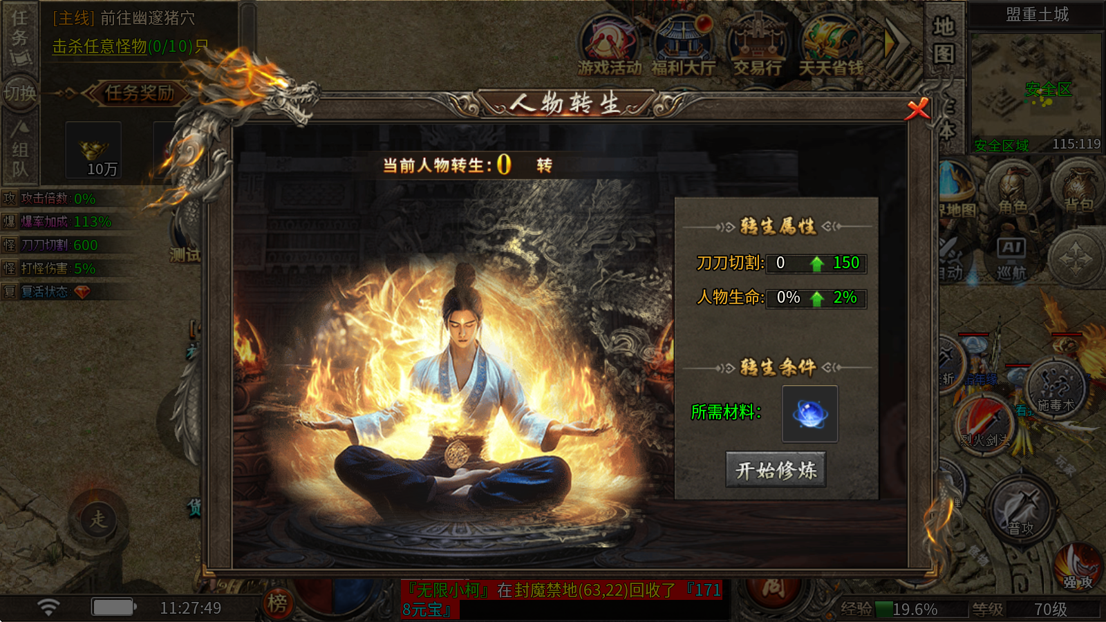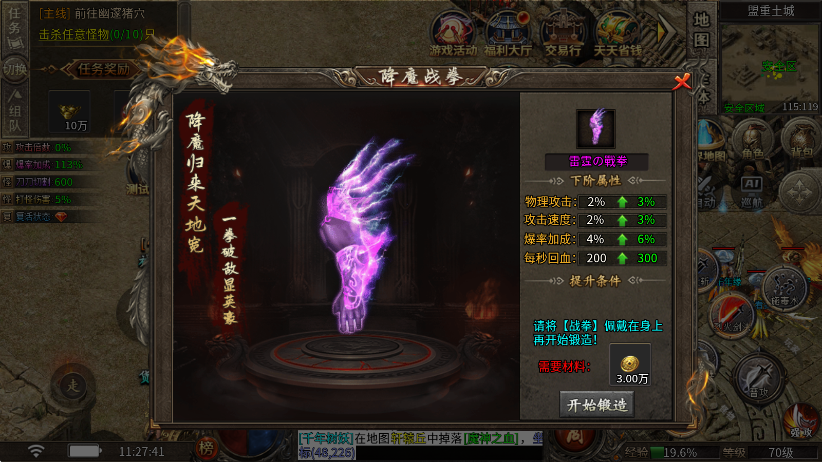 降魔戰拳的提升需要消耗通寶,通過消耗通寶能夠對物理攻擊、攻擊速度、爆率以及每秒回血這些屬性進行增強。