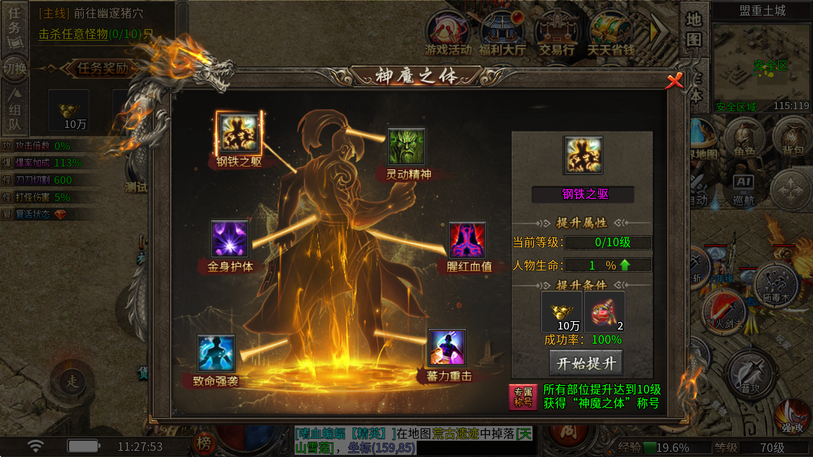 神魔之軀:總計六個部位可供強化,花費元寶與魔神之血就能升級,當所有部位的強化等級都達到10級時,即可解鎖“神魔之軀”稱號。