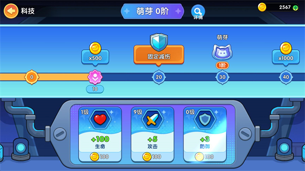 點擊科技按鈕能夠消耗金幣來增強所有英雄的屬性,而且提升到特定等級時還會獲得額外獎勵。