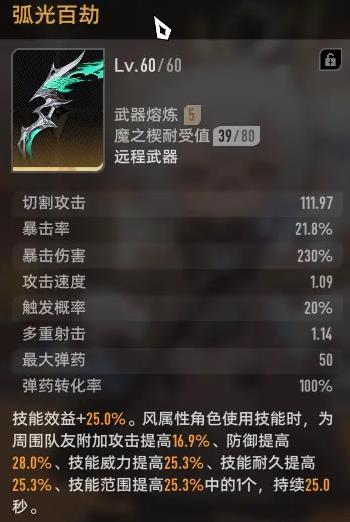 遠程武器推薦選擇弧光百劫,它屬于比較萬能的遠程武器類型。盡管傷害方面稍顯偏低,但它的被動效果能提供25%的技能效益,這一點相當實用。如果搭配上鼓舞效果,就能輕松將技能效益提升至50%。