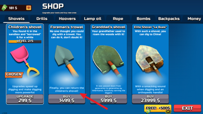 等我們有了足夠的資金,就能在商店里買到更優(yōu)質(zhì)的鏟子,還有炸彈、繩索這類道具。