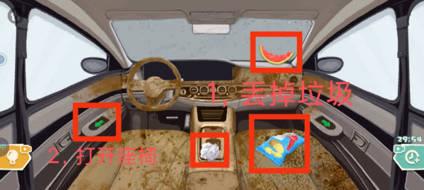 再點擊綠色按鈕把座椅升起來,用右側(cè)的清潔劑將車內(nèi)全部噴灑一遍,隨后用左邊的抹布擦拭干凈。
