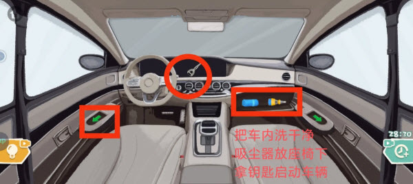 清洗干凈后,把工具放回副駕駛的抽屜,最后用鑰匙打火就能過關(guān)啦。