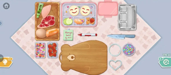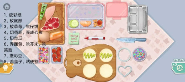 這一關(guān)卡首先要把右下角的亮片撒到便當(dāng)盒底部,再將玻璃便當(dāng)盒放置進去。