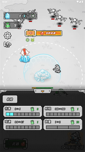 直接進入游戲后,角色會自動收集水晶;不過過一會兒蟲族就會出現,這時候就得布置武器進行防御了。