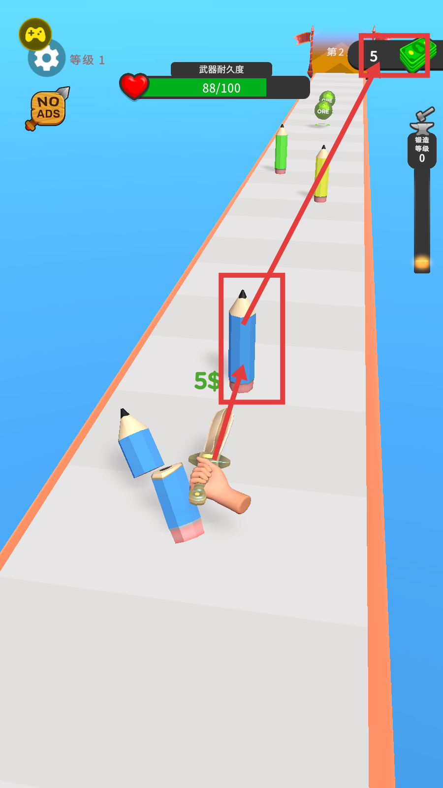 擊碎【藍(lán)色鉛筆】,獲取【5美元】,金幣累計(jì)到【5】,持續(xù)推進(jìn)關(guān)卡,積累資源。