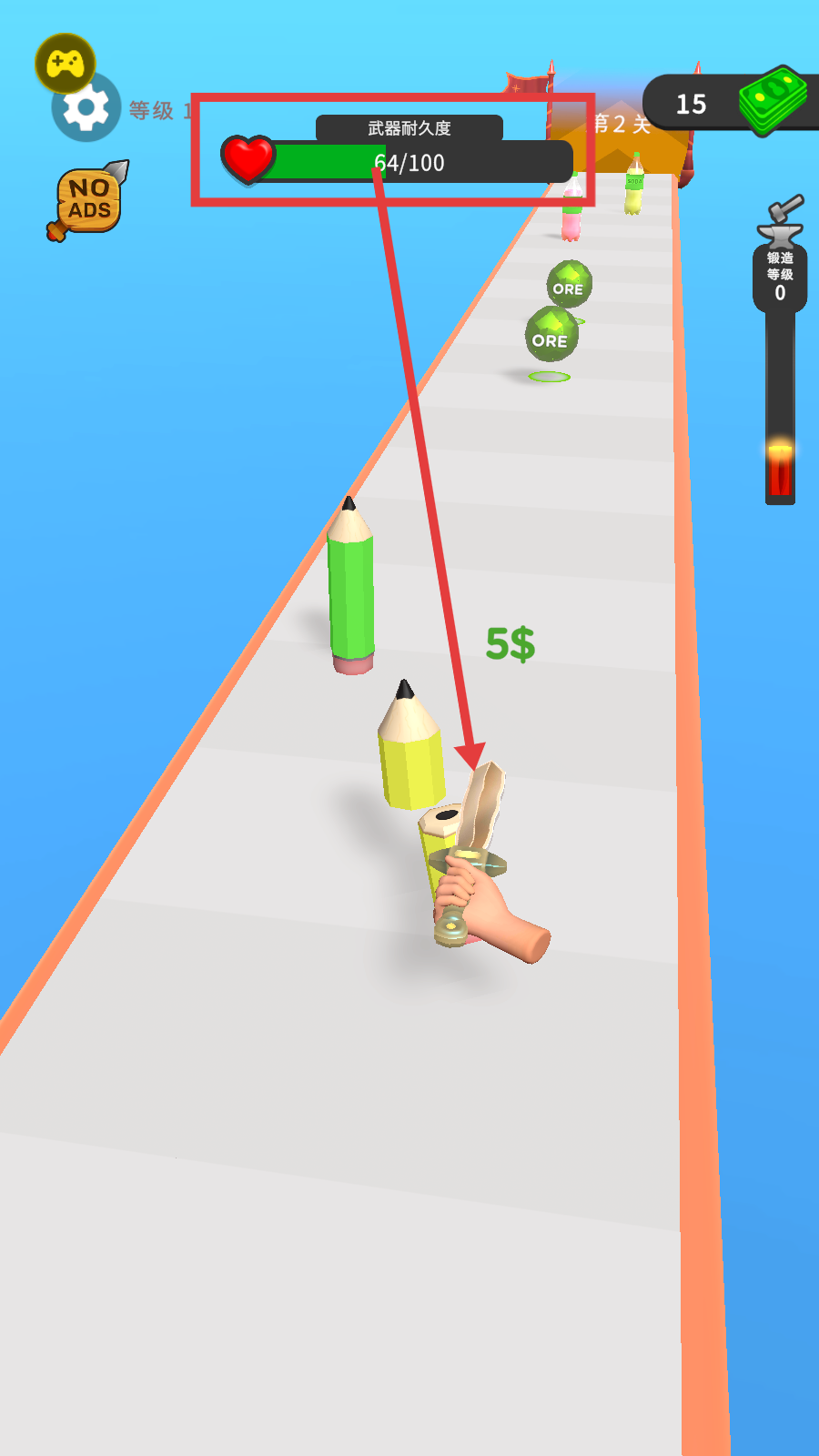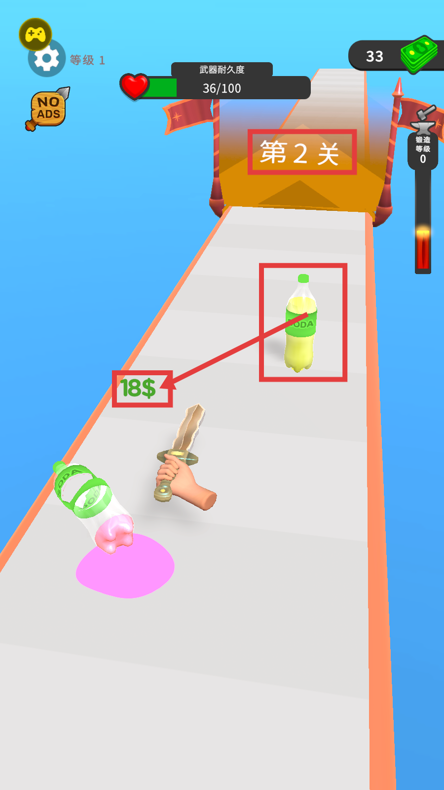 滑動(dòng)屏幕即可開(kāi)啟游戲,初始狀態(tài)下【武器耐久度為100/100】,你需要操控武器進(jìn)行闖關(guān),過(guò)程中要留意維持武器的耐久度。