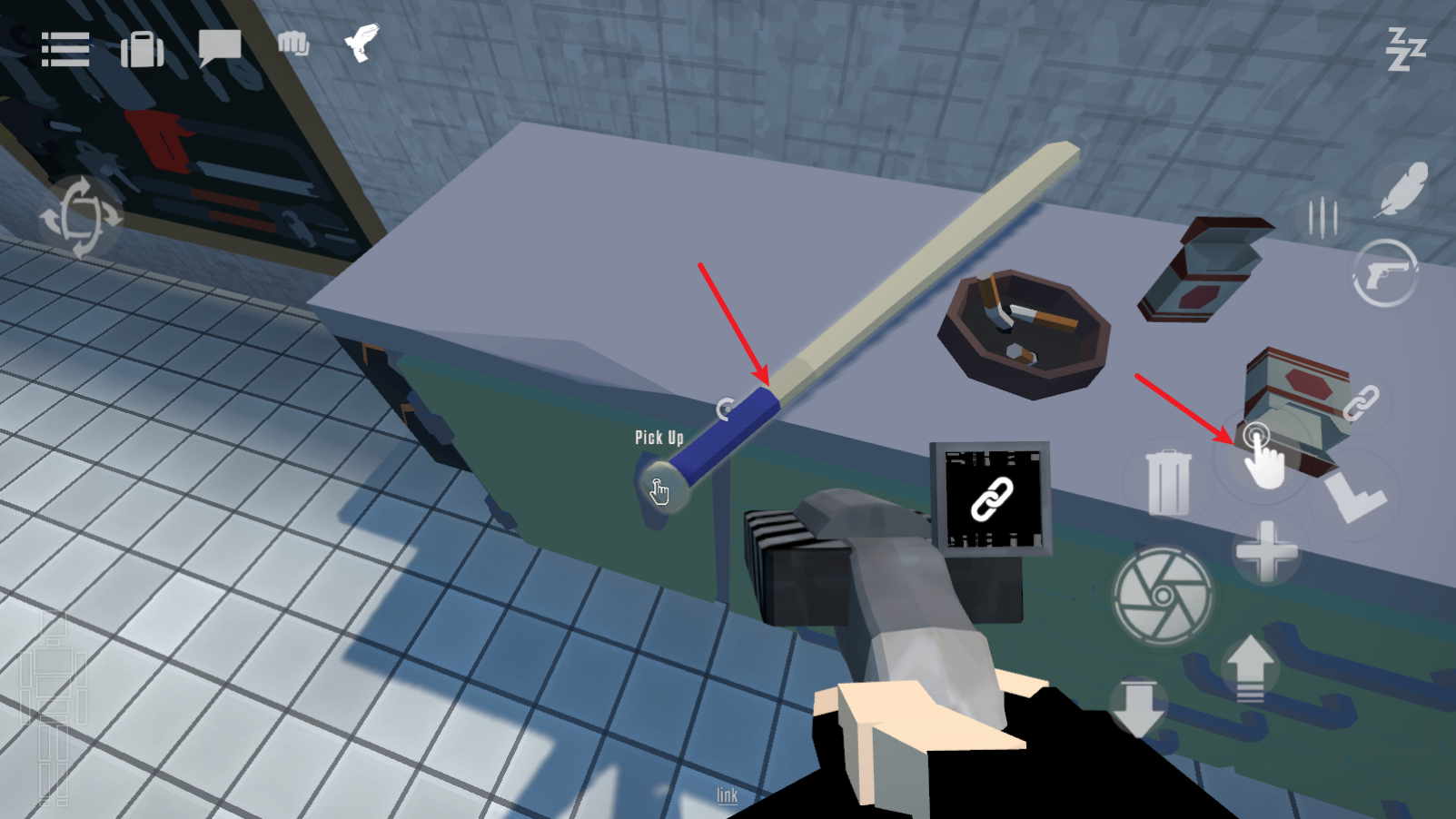 當(dāng)靠近可拾取的武器時(shí),右側(cè)會(huì)彈出交互按鈕,長(zhǎng)按該按鈕即可將武器拿在手中。