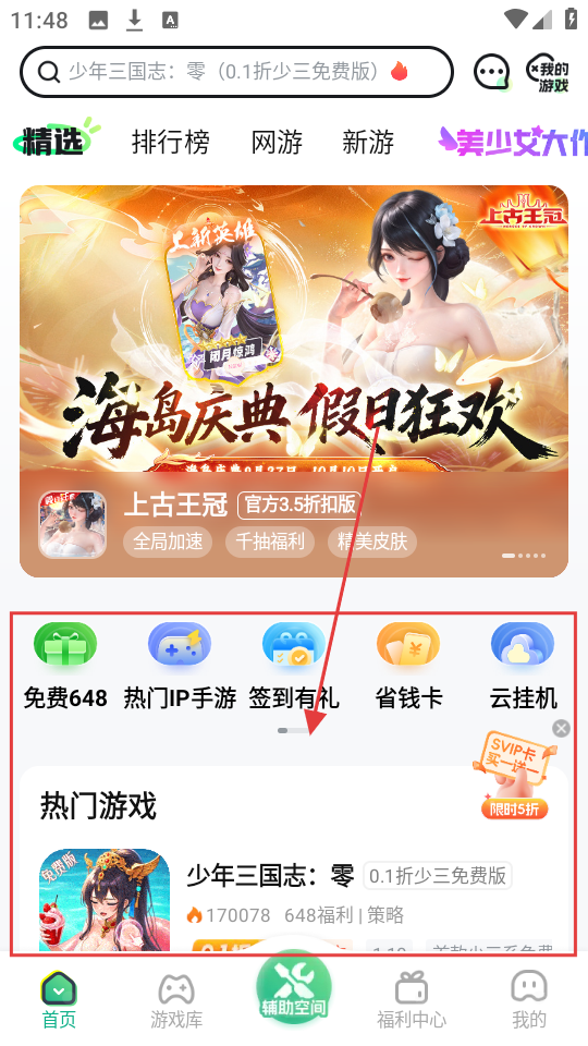 在軟件的首頁,我們可以看到搜索框以及各類游戲推薦,只要點擊熱門游戲中的《少年三國志:零》,就能夠進入到這款游戲的詳情頁面了。