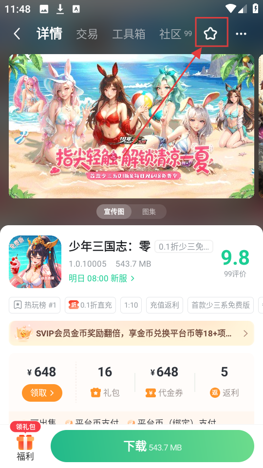 進入游戲詳情頁后,點擊右上角的星形收藏圖標,就能把《少年三國志:零》加入收藏了。
