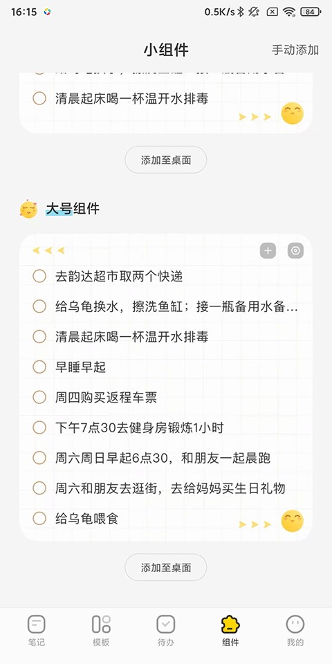 打開指尖筆記應用,找到組件選項并點擊,從中挑選合適的組件樣式,最后點擊添加至桌面即可。