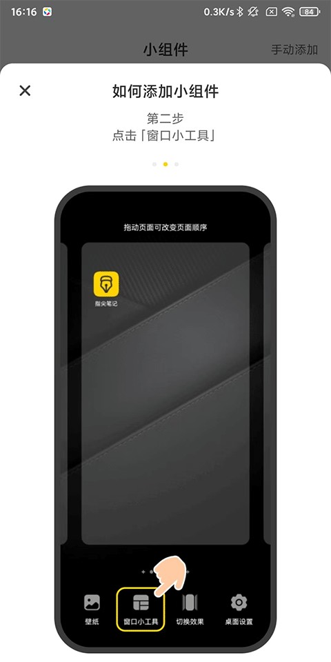 若想了解添加方式,可點擊右上角的“手動添加”查看;具體操作步驟的第一步是用雙指在手機桌面進行捏合動作。