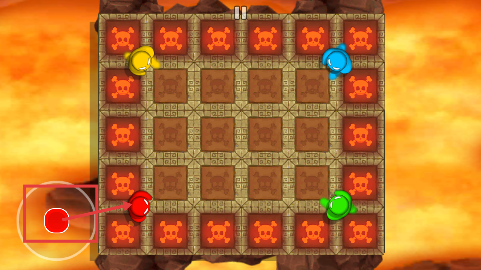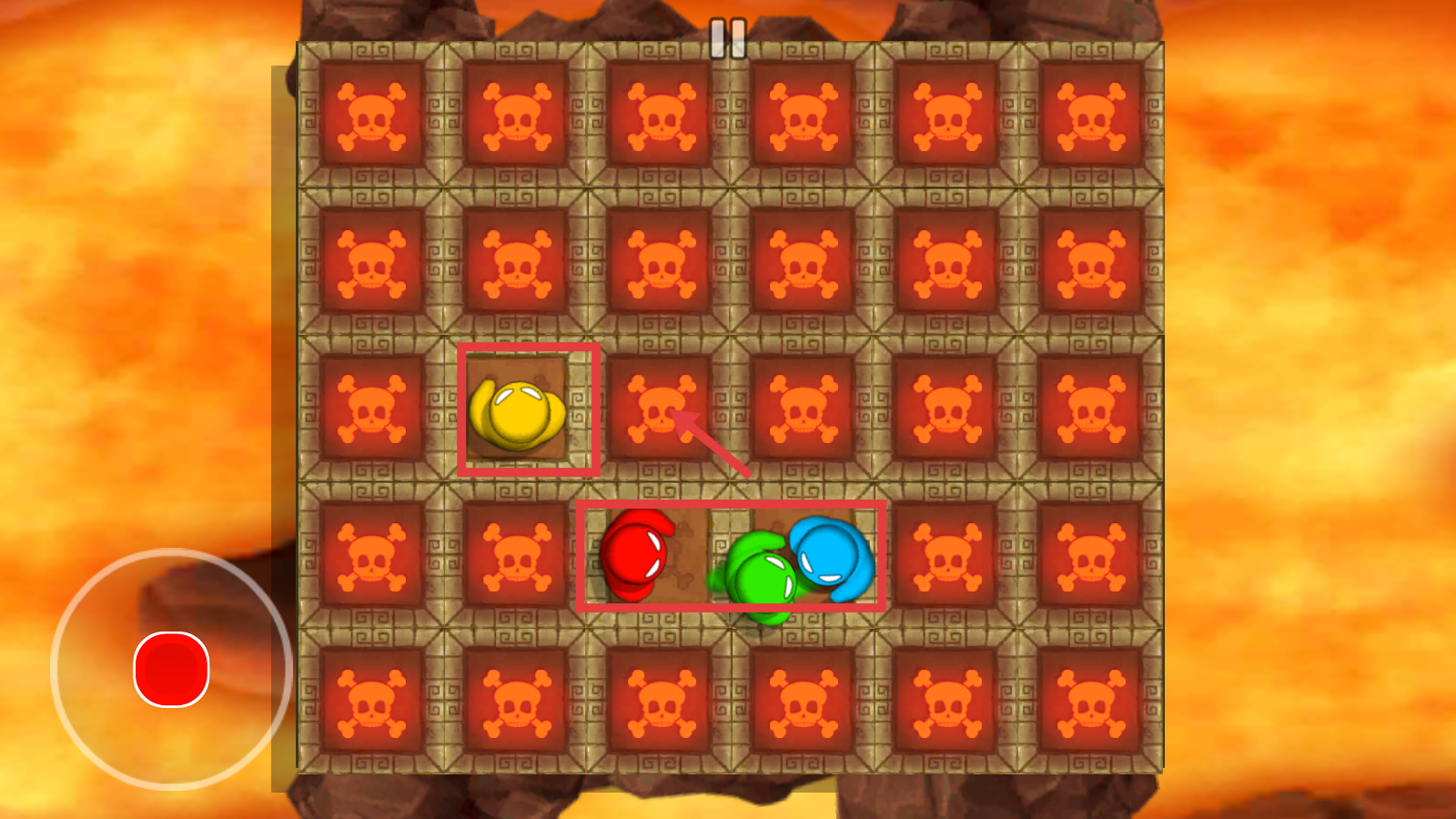 操控左邊的紅色按鈕,來控制【紅色角色】的移動,要避開帶有骷髏標識的危險格子,規劃出安全的行進路線,開啟這場生存挑戰。