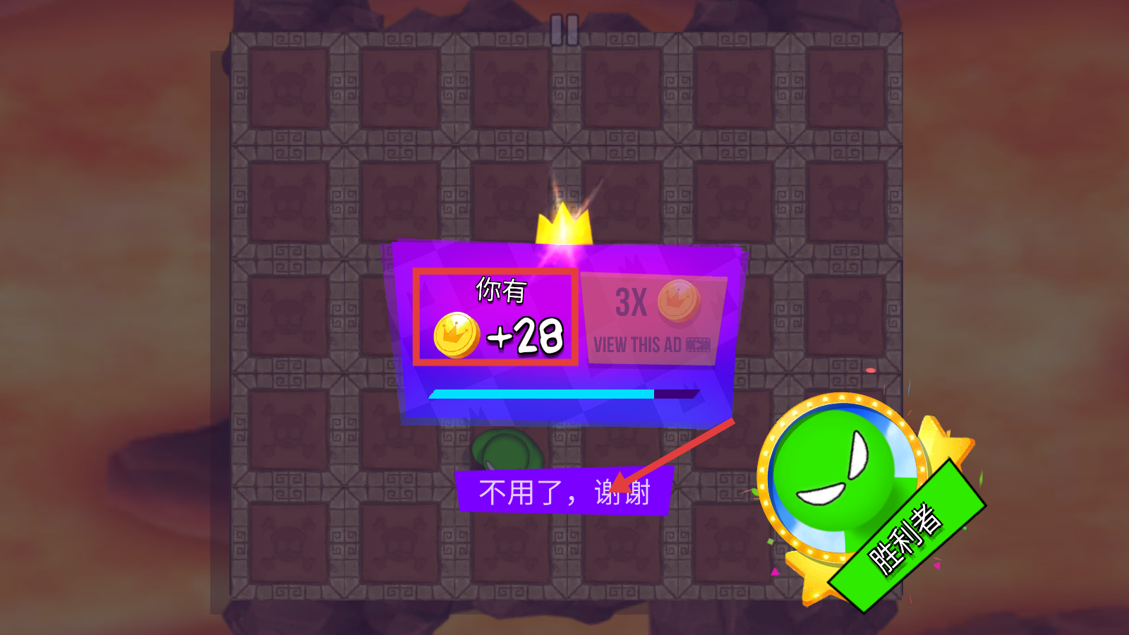 獲勝后可獲得【+28金幣】的獎勵,待看到勝利者標識出現時,點擊【不用了,謝謝】,即可繼續挑戰下一局。
