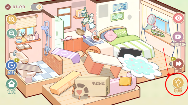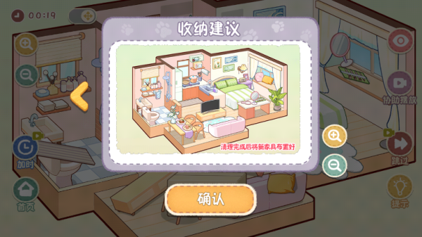 以“搬家日記”關卡為例,玩家能夠借助游戲里提供的各類道具對房間進行布置。
