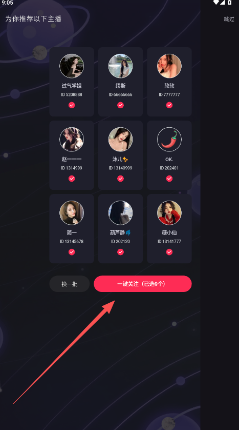 登錄后,系統(tǒng)會(huì)為根據(jù)大數(shù)據(jù)用戶習(xí)慣智能推送一批主播,可點(diǎn)選部分關(guān)注也可以關(guān)注全部。